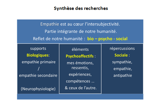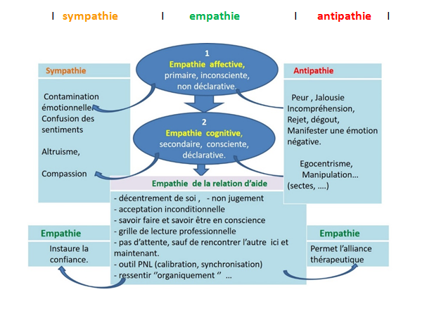 - Les niveaux neurobiologiques de l’empathie : l’empathie primaire ou affective, l’empathie secondaire ou déclarative, (dont l’empathie de la relation d’aide).